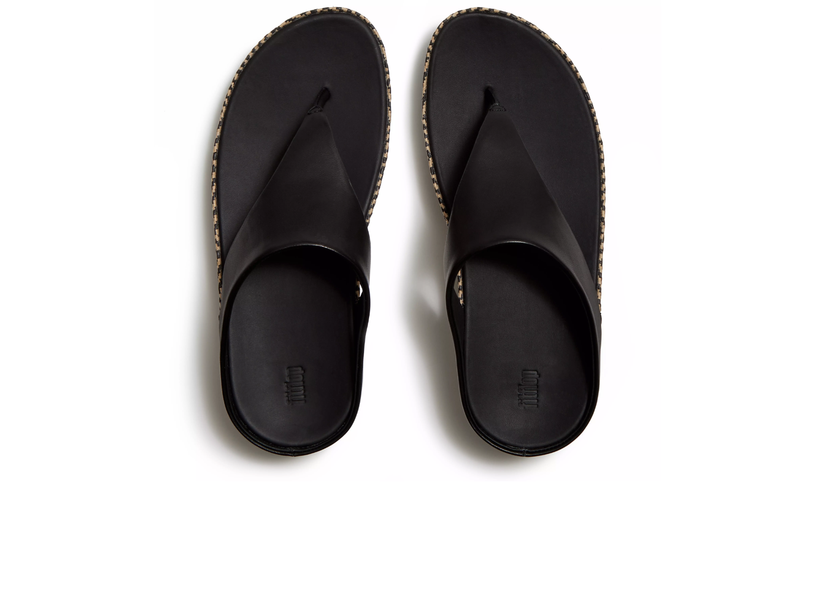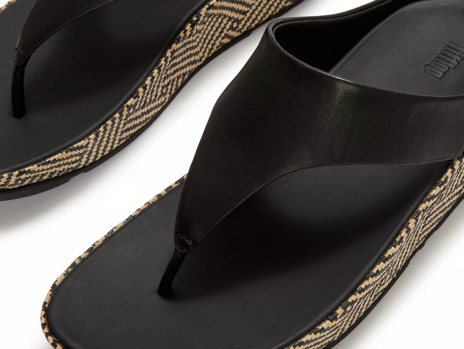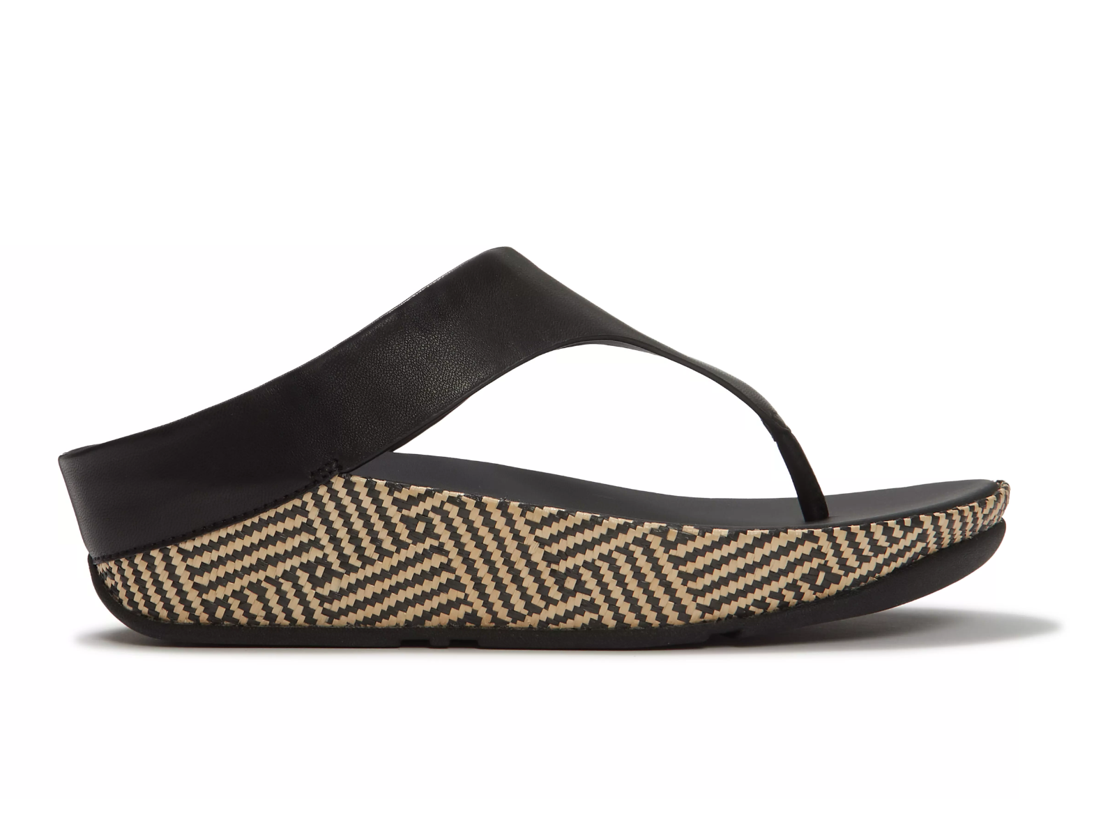 Upper: Soft, high-quality leather in a timeless toe-post design, securing a sole wrapped in a bold, monochromatic graphic pattern for a refined finish