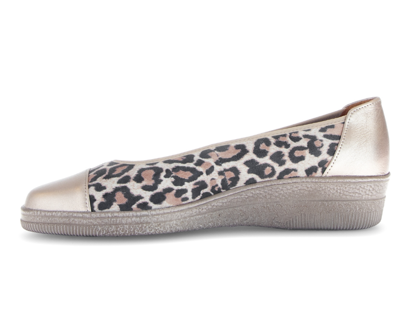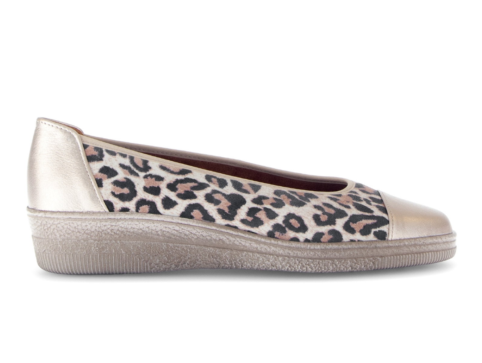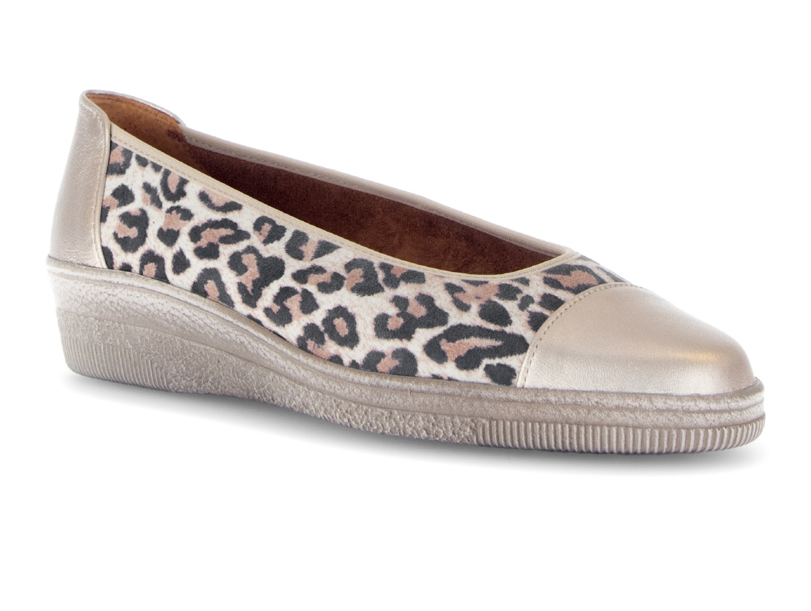 The Gabor 86.042.90 Petunia in Wild Cat Gold combines bold leopard print with chic gold accents for effortless style. The Gabor 86.042.90 Petunia in Wild Cat Gold features a slip-on design with moderate width, offering comfort and freedom of movement from Walsh Brothers Shoes, Tralee.