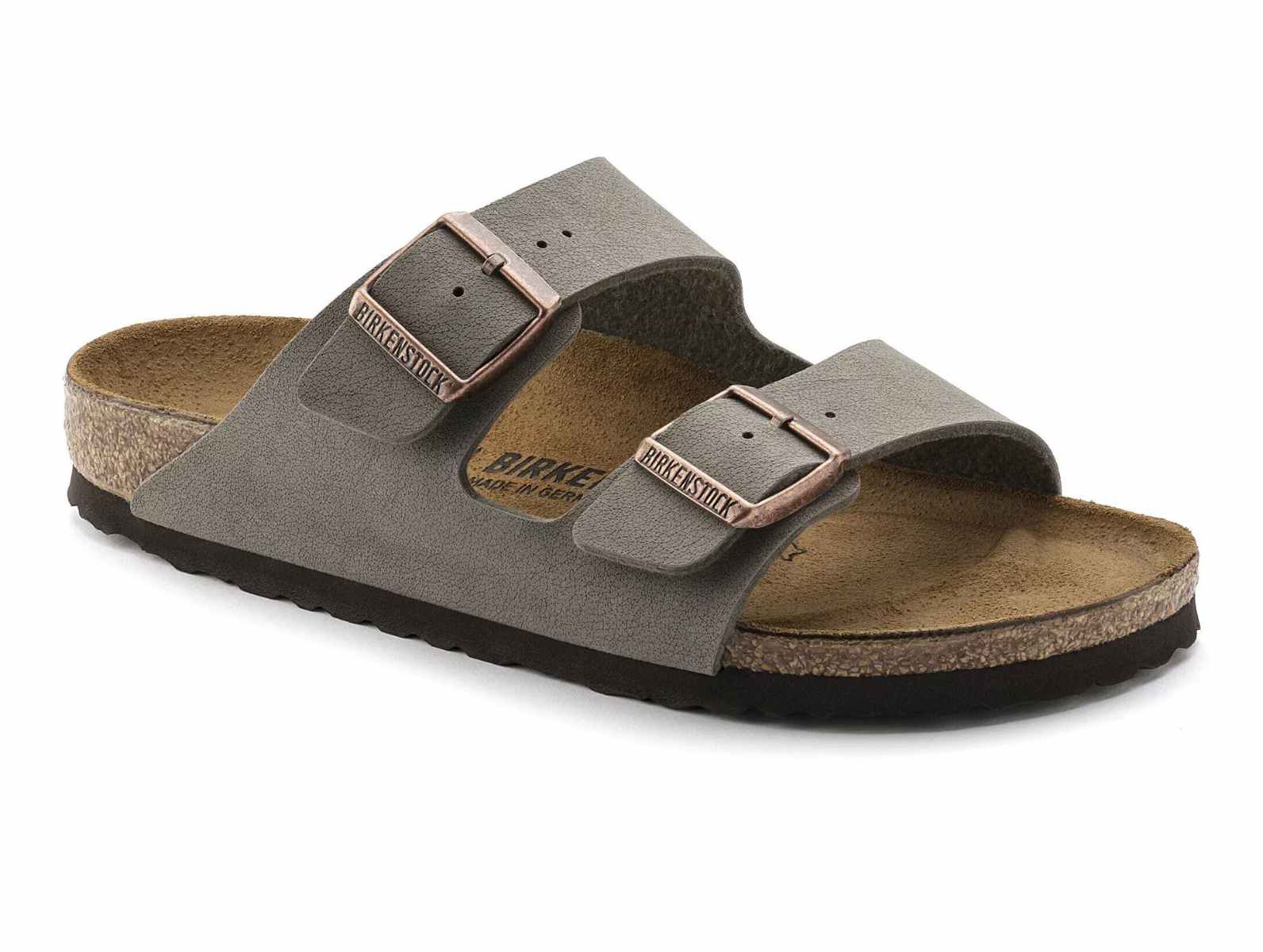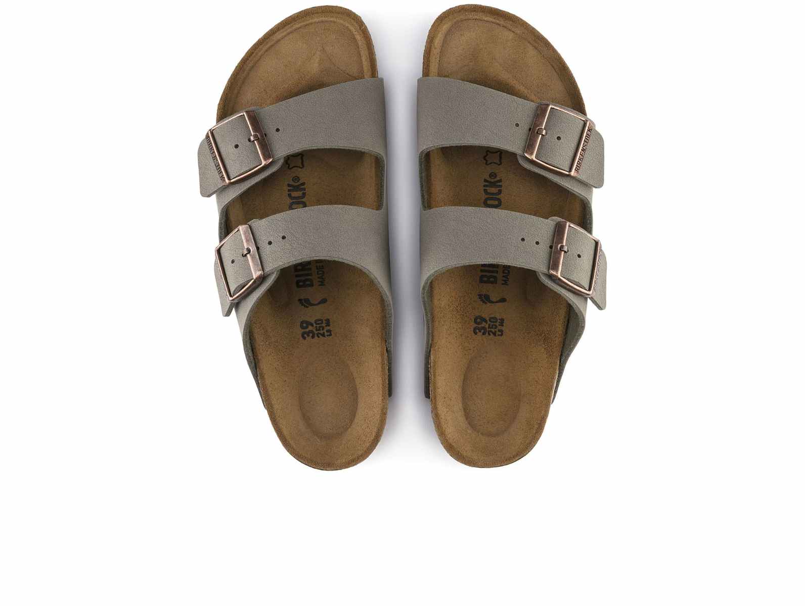 Embrace a heritage of comfort with the Birkenstock Arizona in Stone, a timeless two-strap sandal that has remained a style icon since 1973. This edition is crafted from signature Birkibuc®, a durable synthetic material with a lightly brushed finish that perfectly mimics the look and feel of authentic nubuck leather.