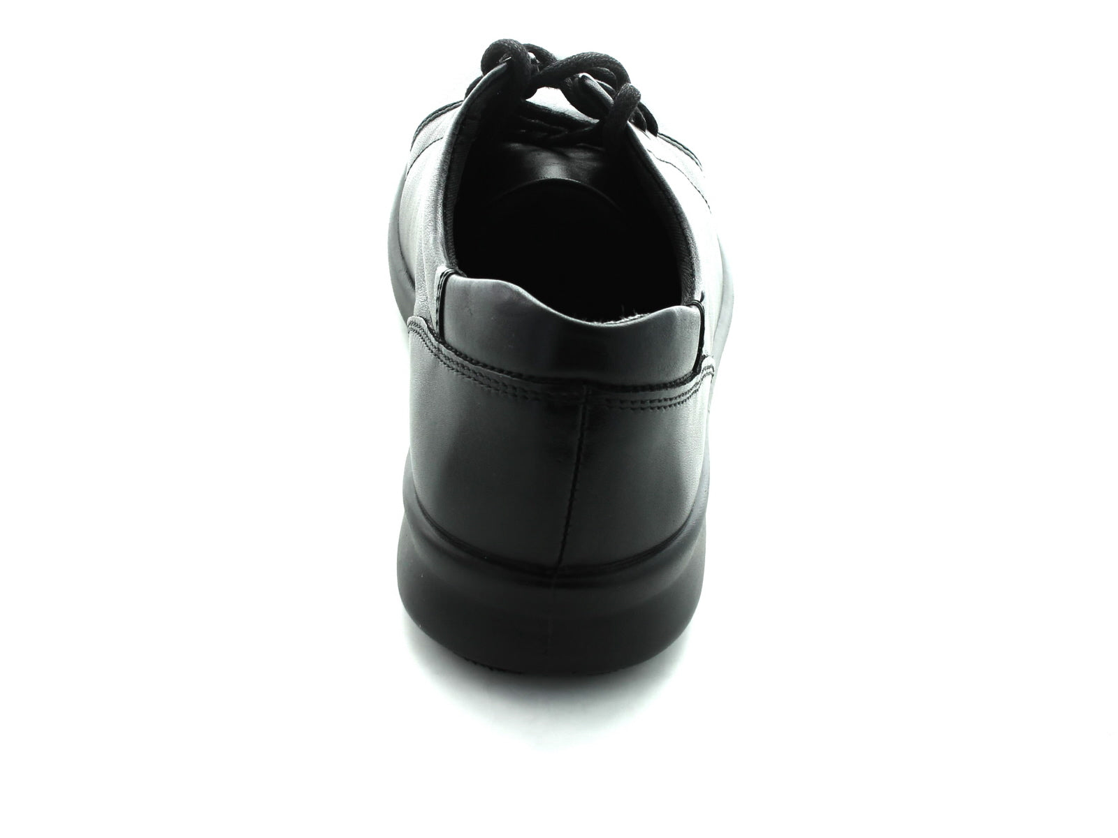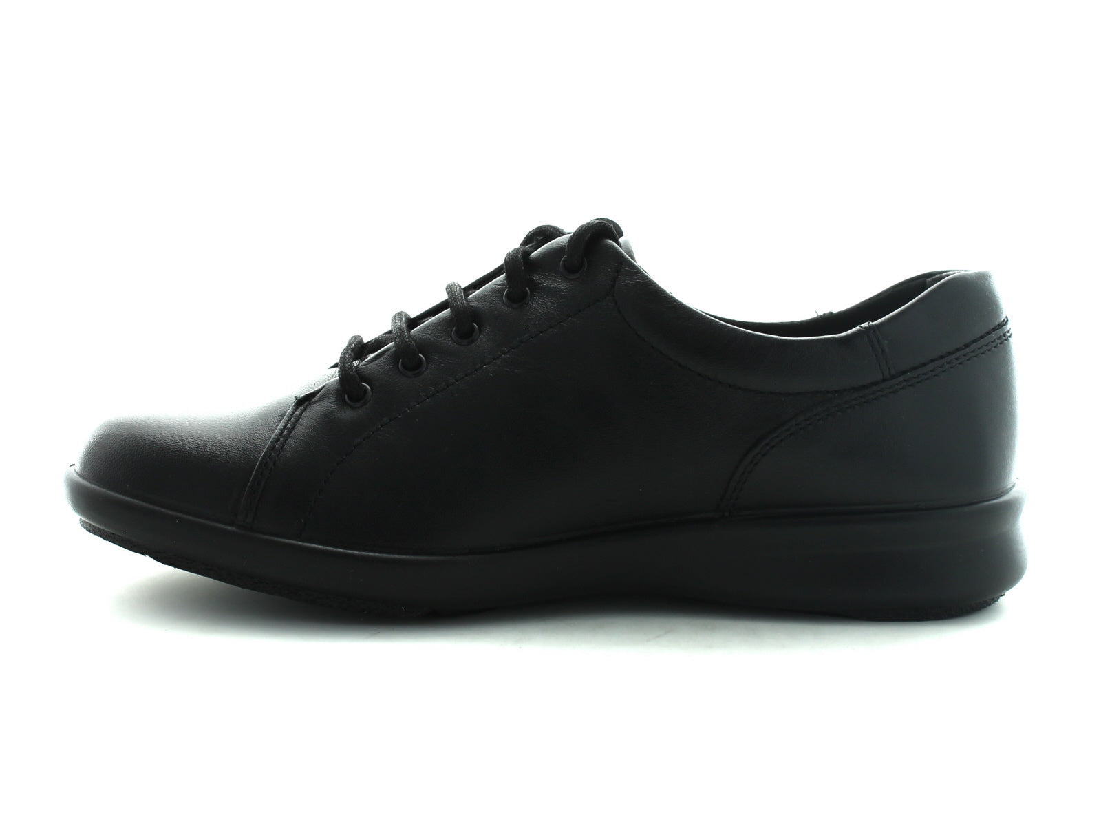 Ladies extra wide fitting shoes in black leather featuring a lace up fasten and stitched detail. The insoles of the shoes can be removed if extra depth is needed.