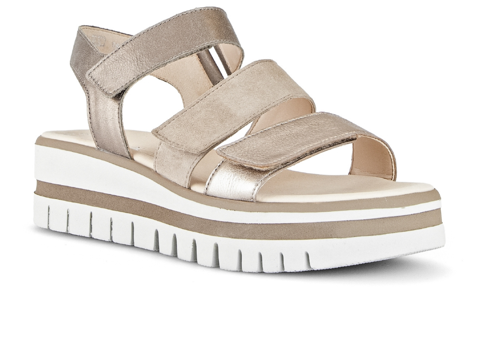 The Gabor 84.620.62 Alfa - Gold Combi is a stylish ladies’ casual sandal designed for comfort and ease. The Gabor 84.620.62 Alfa features a 5.5 cm heel, Velcro fastening and a wider thread area for added comfort, available now at Walsh Brothers Shoes, Tralee.