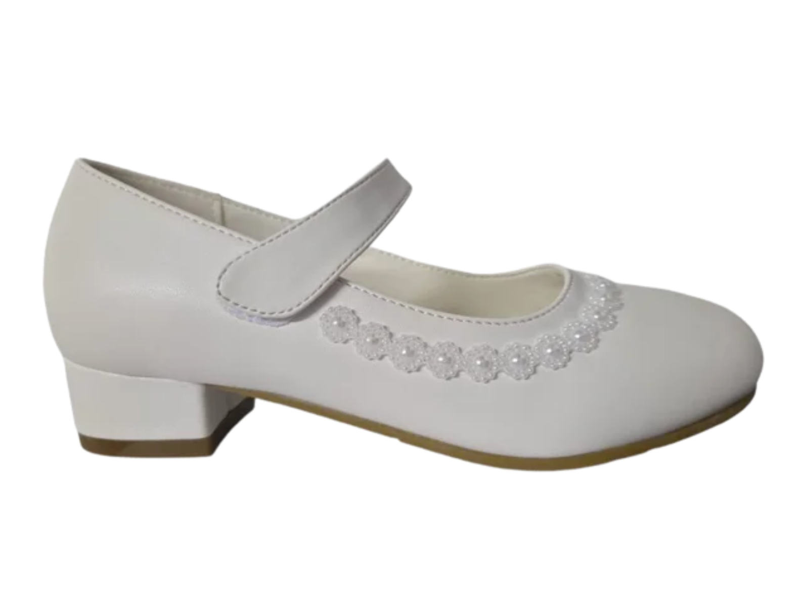 Dubarry's Velma communion shoe combines timeless elegance with practical comfort. The smooth white faux leather upper is adorned with delicate pearl floral detailing, creating a refined look perfect for special occasions.
