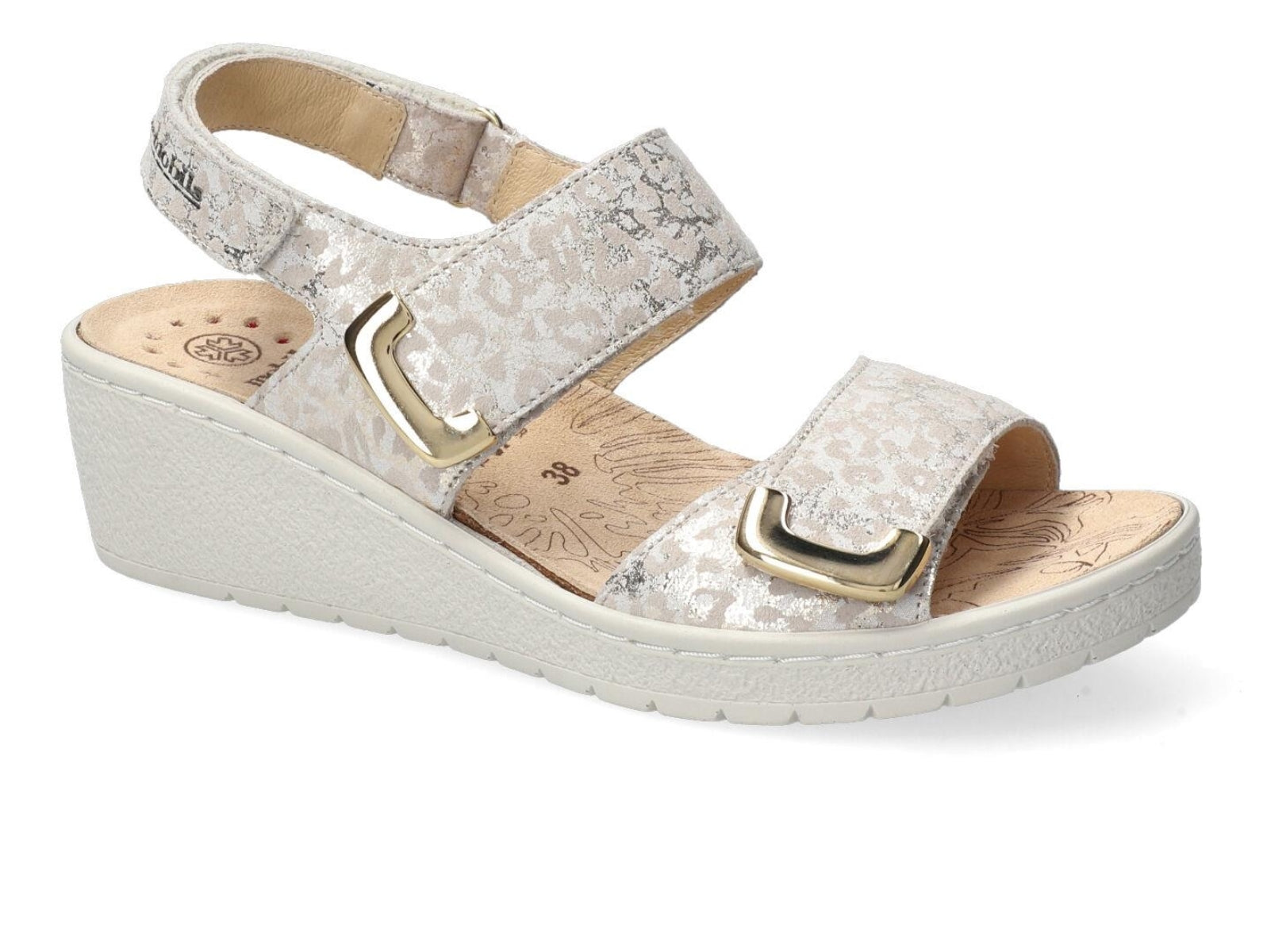 The Mobils Pam Chic sandal offers a perfect blend of feminine elegance and comfort. The light sand colour is accented with a subtle animal print and flecks of gold, making it a stylish choice for casual wear. The ultra-lightweight design, removable insoles, and slip-resistant sole ensure all-day comfort. With 3 Velcro straps for an individual fit and easy on and off, the Mobils Pam Chic sandals from Walsh Brothers Shoes, Tralee are the perfect combination of fashion and functionality.